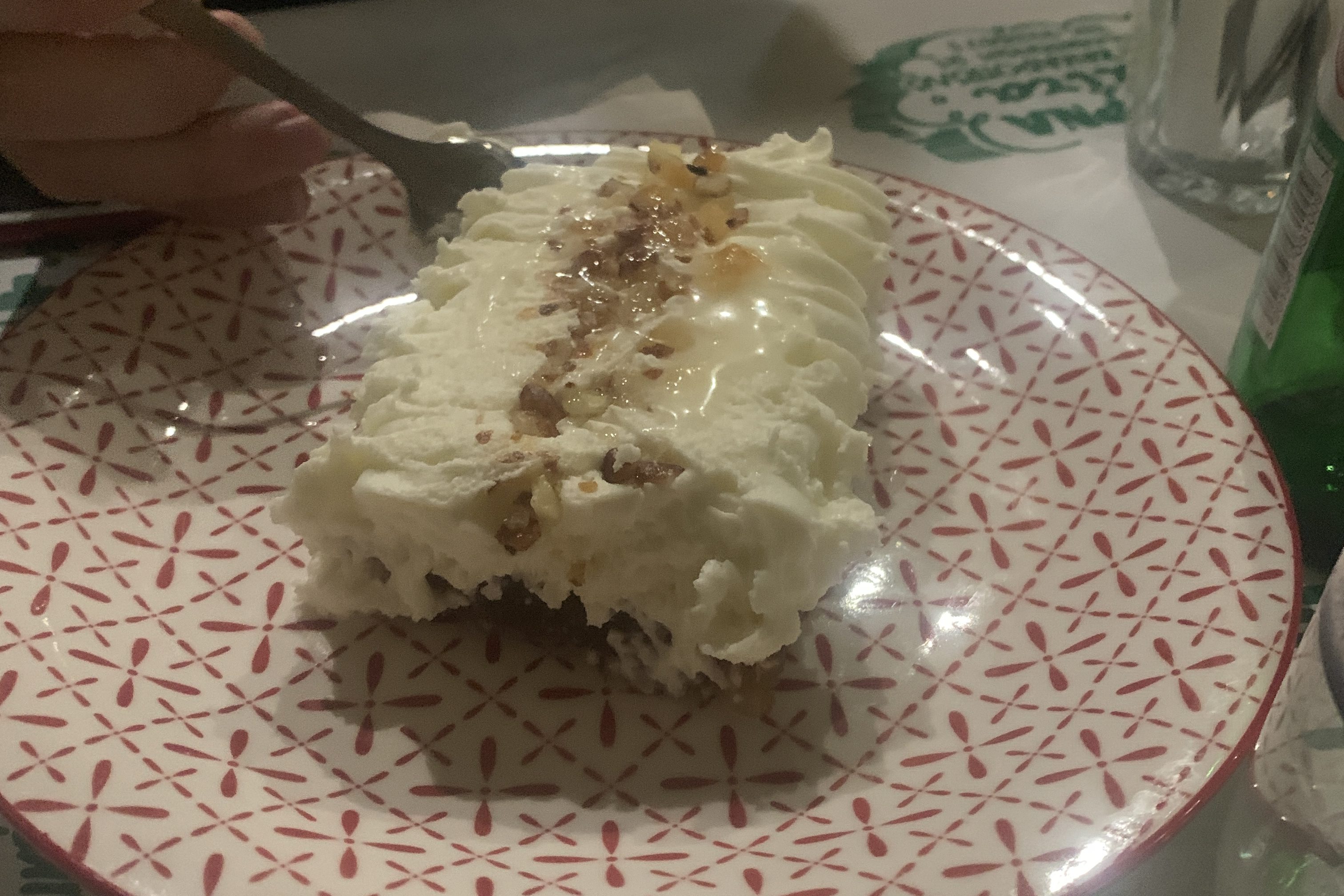 Ekmek Kataifi is a dessert made from shredded phyllo dough drenched in syrup, topped with custard and whipped cream. I enjoyed this sweet treat thanks to my coworkers who brought it to our meal.